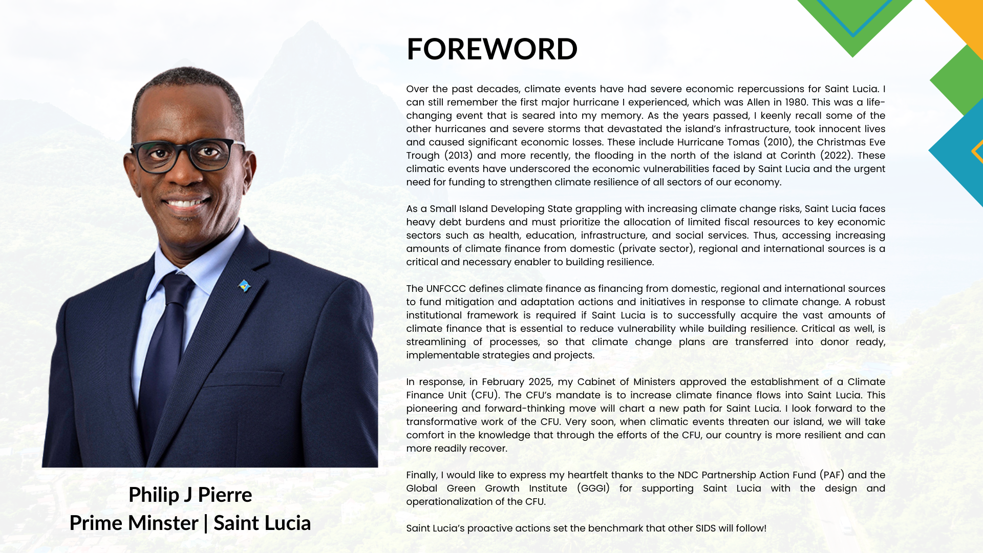 The CFU’s mandate is to serve as the coordinating entity, leading national efforts to mobilize, access, manage, monitor and report on funding into Saint Lucia from regional and international sources to address climate change impacts.